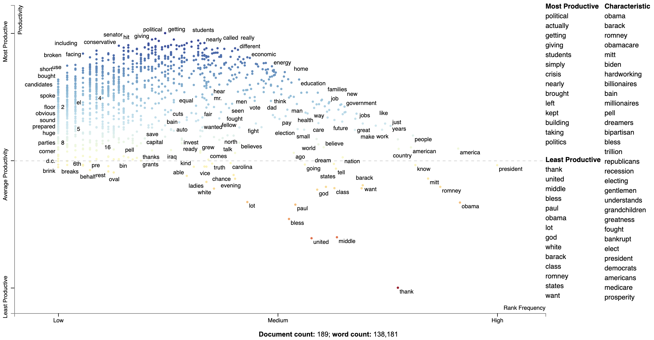 The interesting things happen close to the upper-left and lower-right corners. In the upper-left corner, words like "auto" (as in auto bailout) and "millionaires" are frequently used by Democrats but infrequently or never used by Republicans. Likewise, terms frequently used by Republicans and infrequently by Democrats occupy the bottom-right corner. These include "big government" and "olympics", referring to the Salt Lake City Olympics in which Gov. Romney was involved.