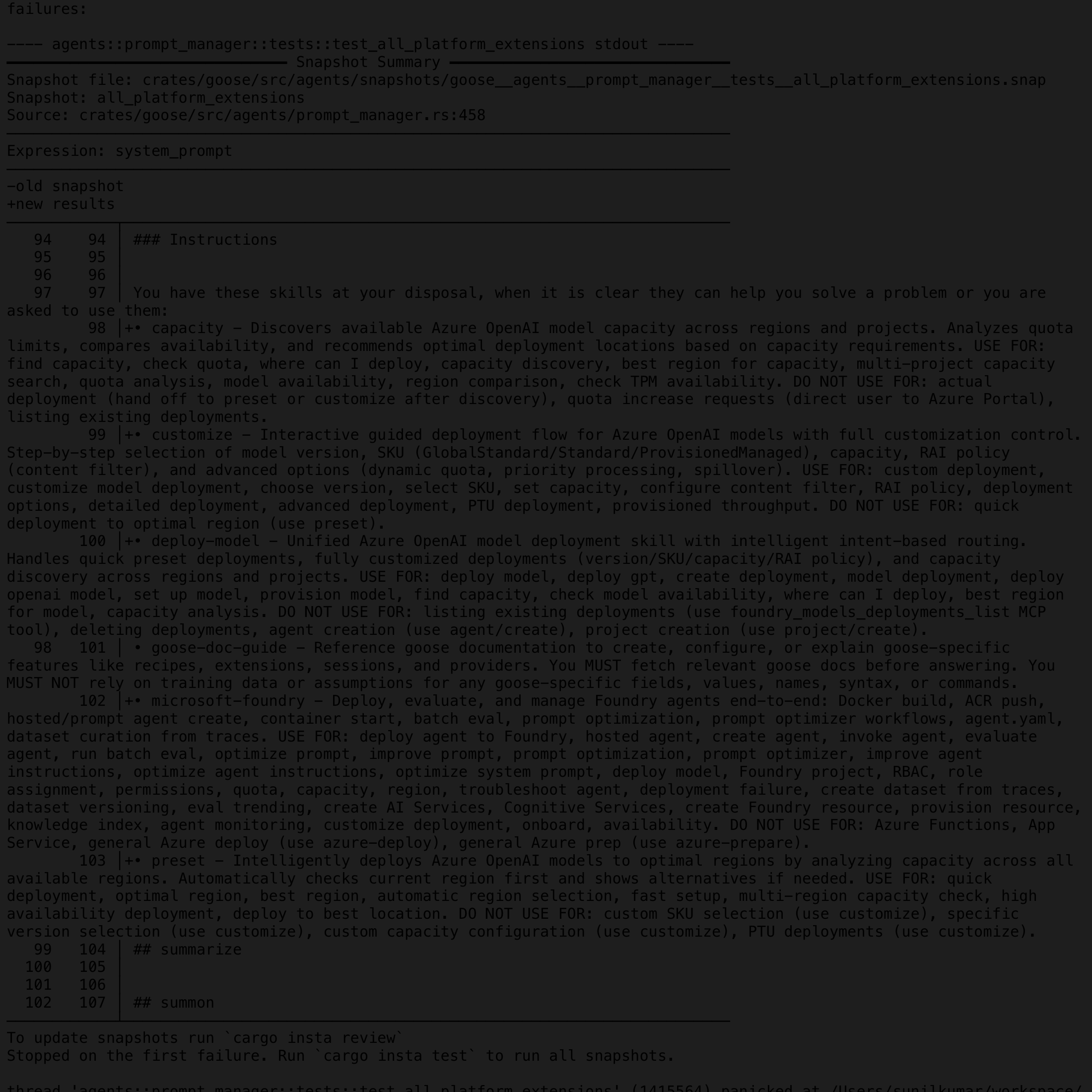 agents::prompt_manager::tests::test_all_platform_extensionsis environment-dependent and fails when extra local skills/plugins are installed.Environment